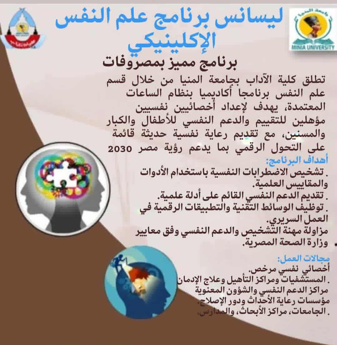 برنامج "علم النفس الإكلينيكي" بقسم علم النفس، كلية الآداب، جامعة المنيا، هو برنامج مميز بمصروفات بنظام الساعات المعتمدة، يهدف إلى إعداد الأخصائي النفسي، والمرشد النفسي، ؛ ينمي مهاراته ويرفع كفاءته، في مجالات التقييم والتشخيص والدعم النفسي للاضطرابات النفسية للأطفال والراشدين والمسنين. ولتقديم الرعاية النفسية الموجهة وكذلك القائمة على أساسيات التحول الرقمي، لتحسين الصحة النفسية وجودة الحياة لأبناء المجتمع بما يعزز رؤية مصر2030