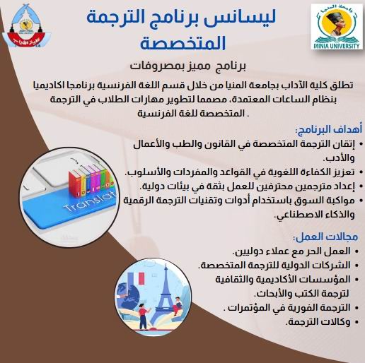 تطلق كلية الآداب بجامعة المنيا من خلال قسم اللغة الفرنسية برنامجا اكاديميا بنظام الساعات المعتمدة، مصمما لتطوير مهارات الطلاب في الترجمة المتخصصة للغة الفرنسية